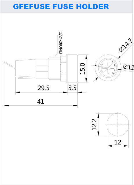 1. 10A 250V AC 6.3A 250V AC 2. ∅5.2x20mm 3. Screw type cap 4. Soldering terminal 5. P.B.T