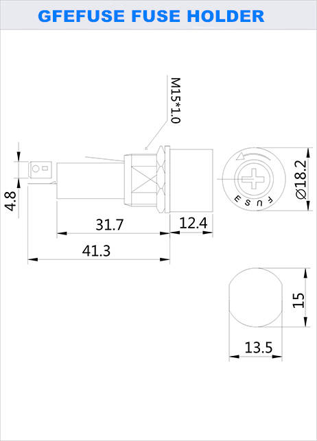 1. 10A 250V AC 2. ∅6.35X31.75mm 3. Screw type cap 4. Faston 5. Phenoric resin