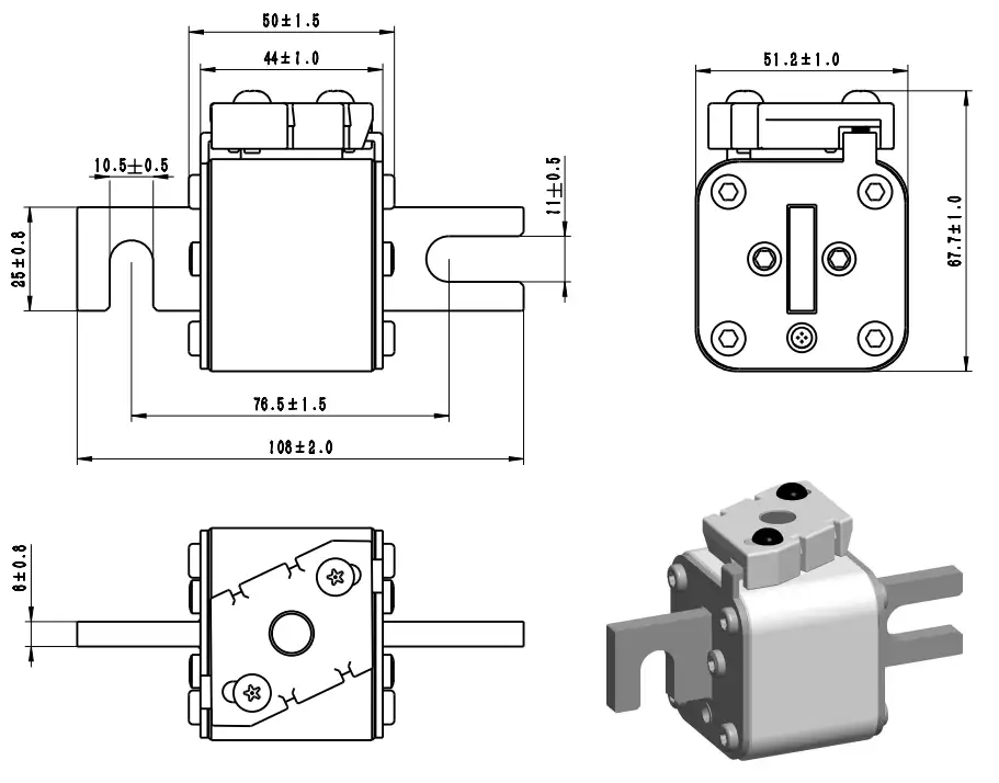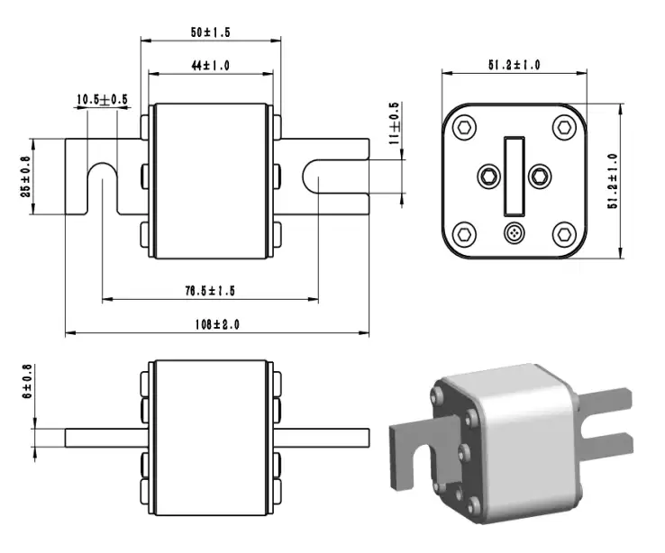 | Part No. | Fuse Amps | Size | Average @50KA/250Vdc | Power Loss (W) | |